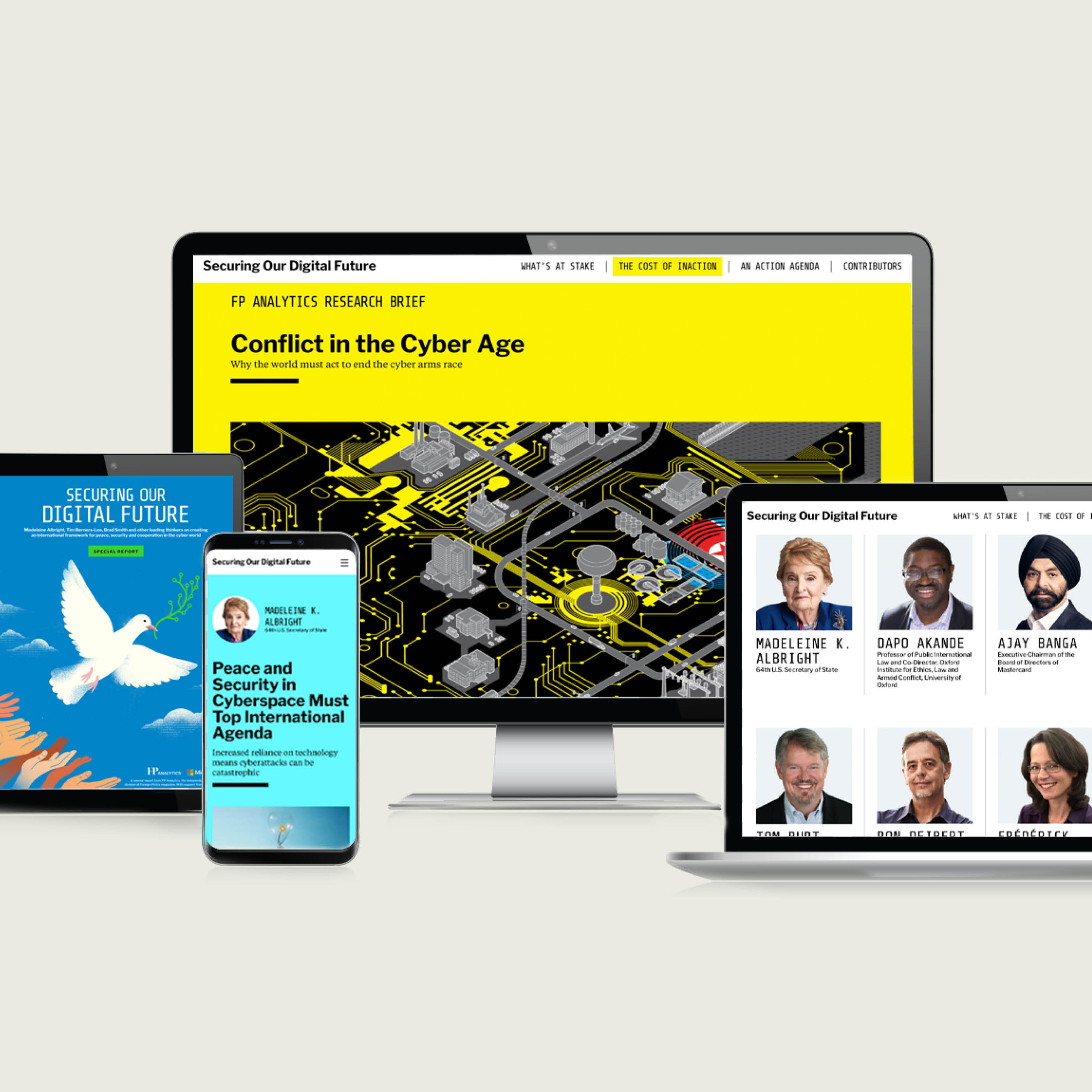 The Securing Our Digital Future report, delivered in partnership with Microsoft, highlighted the increased weaponization of cyberspace by state and non-state actors and the costs of inaction. Featuring insights from thought leaders like Madeleine Albright, Tim Berners Lee, Irene Kahn, Peter Maurer and Brad Smith, among others, the report was an informative call to action for greater cross-border collaboration on cybersecurity. The project was produced as an interactive microsite and published for distribution to key stakeholders at the 2021 UN General Assembly.
