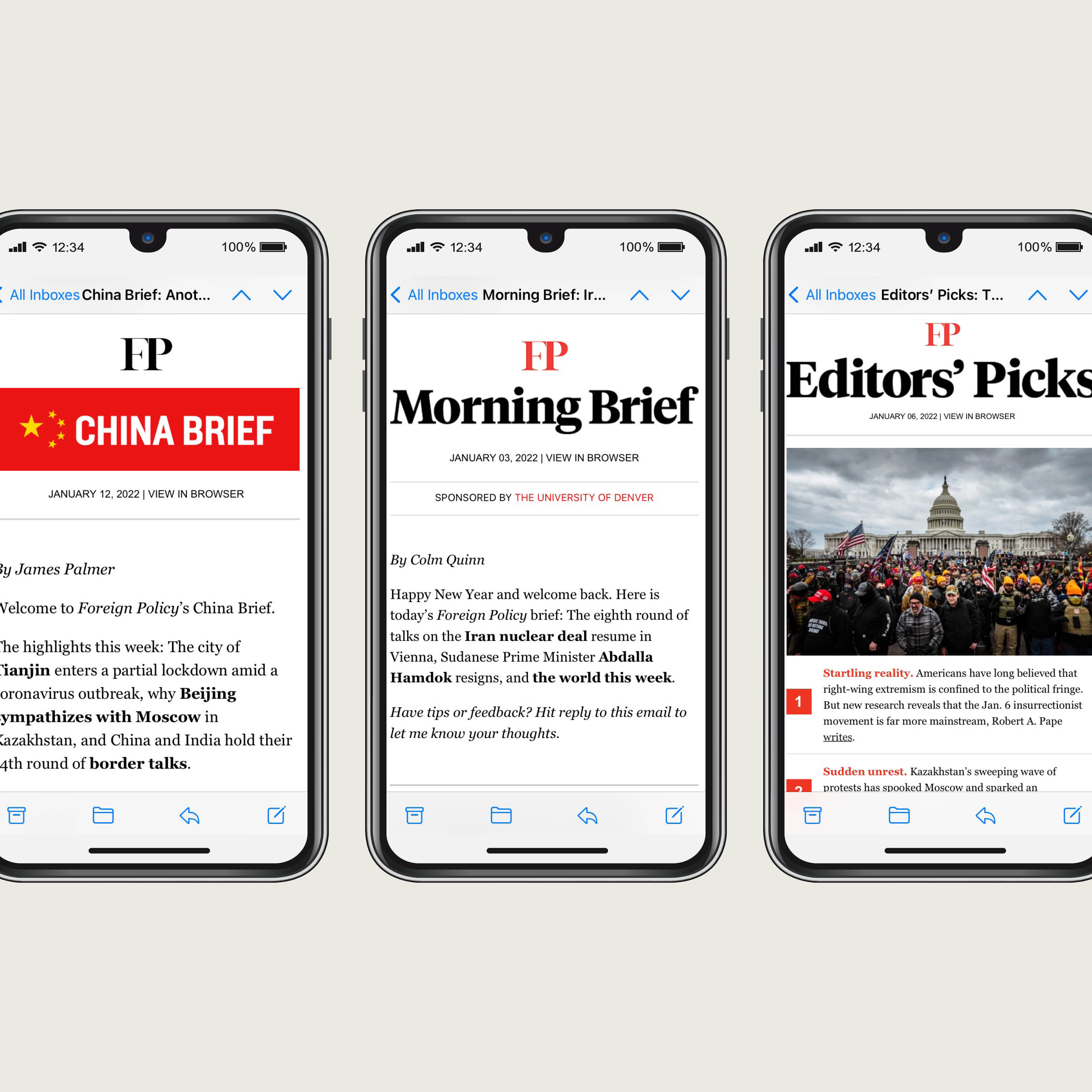 FP’s daily and weekly newsletters reach 860,000+ subscribers, covering a range of topics from broad global affairs to defense to regional news. Our newsletter sponsors can engage policymakers, business executives, and other influencers with messaging delivered directly to their inboxes alongside trusted FP content .