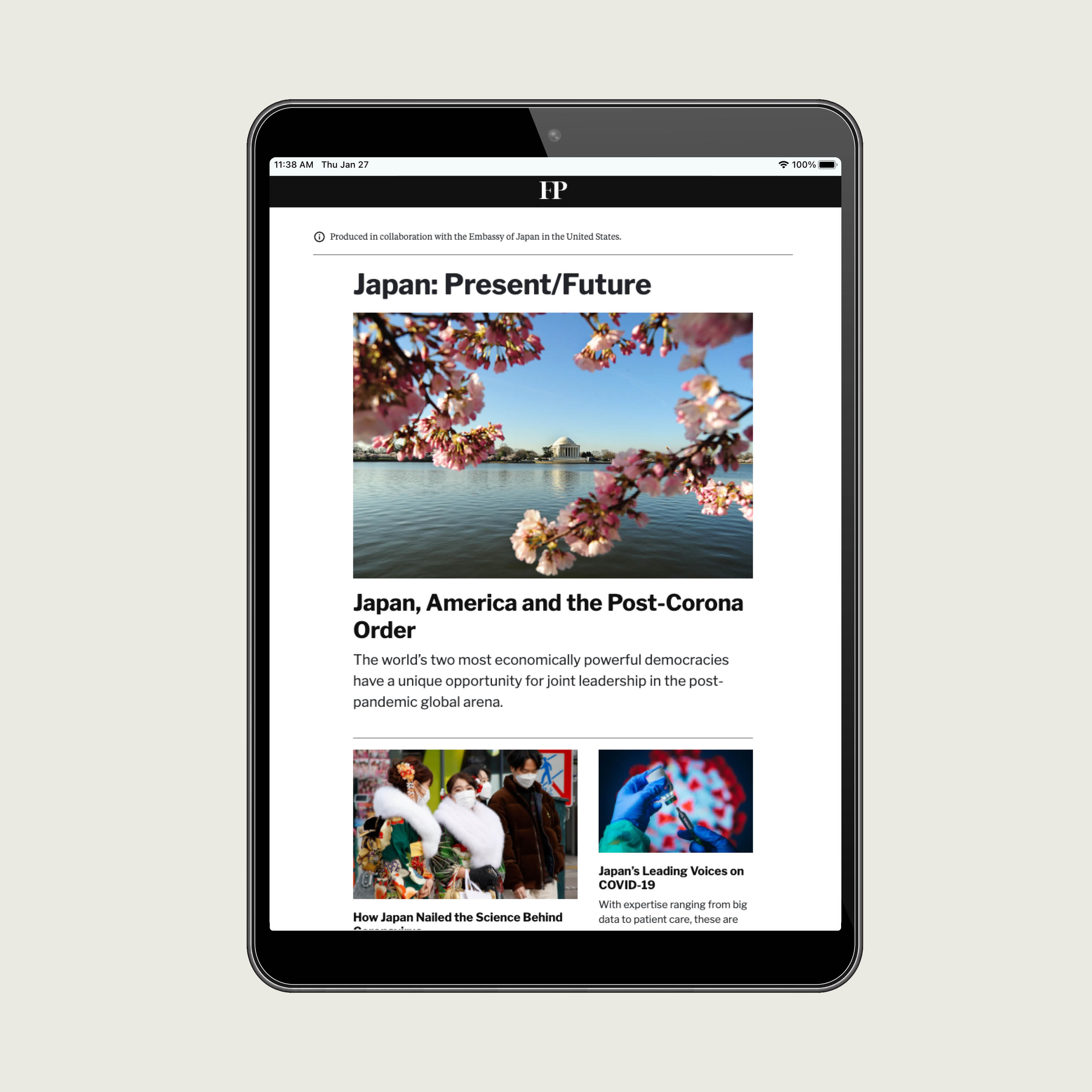 The Government of Japan partnered with FP to deliver a country report that showcased the Suga administration’s priorities as well as Japan’s recent domestic and international successes. Featuring insights from senior government officials like Digital Transformation Minister Takuya Hirai and Ambassador to the U.S. Koji Tomita, the 20-page report was published in FP’s summer 2021 print magazine, hosted on a bespoke landing page on foreignpolicy.com, and promoted through an extensive digital ad, newsletter, and social media campaign.